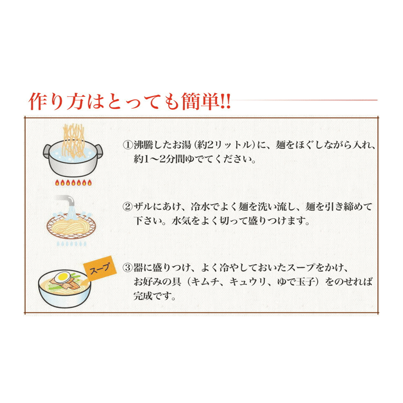 - 冷麺スープを200ccの冷水で溶き、冷やした麺を入れて出来上がりです。